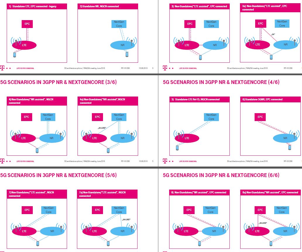 At the June meeting in Busan, Deutsche Telekom summarised the possible architecture options that take into account LTE Radio in its Release 15 version (ie a very advanced LTE) and also Next Generation Radio (5G). Plus any architecture would have to provide aggregation of both technologies in two variants. Any architecture must also incorporate the existing LTE core network (EPC) and a next generation core (NGCN).